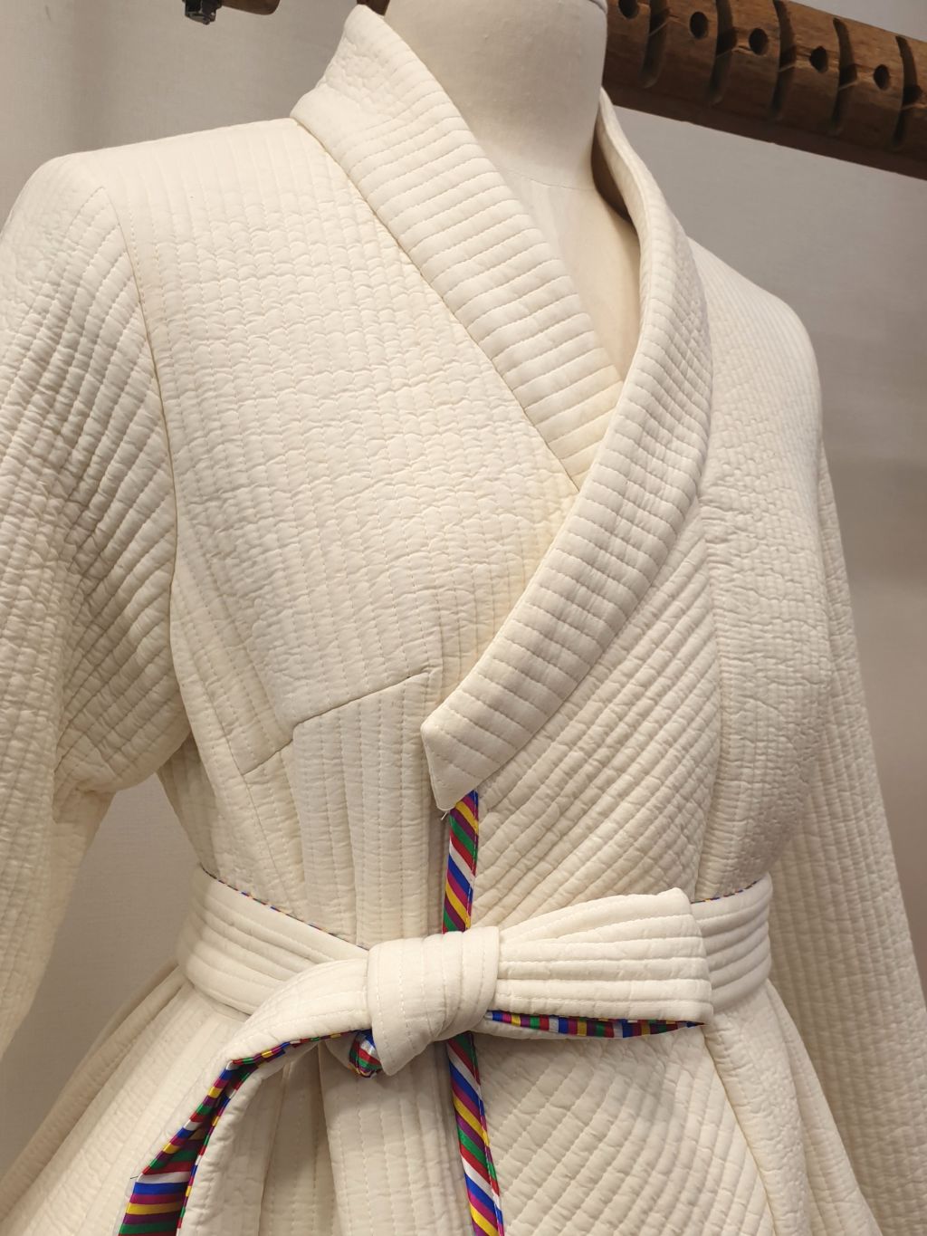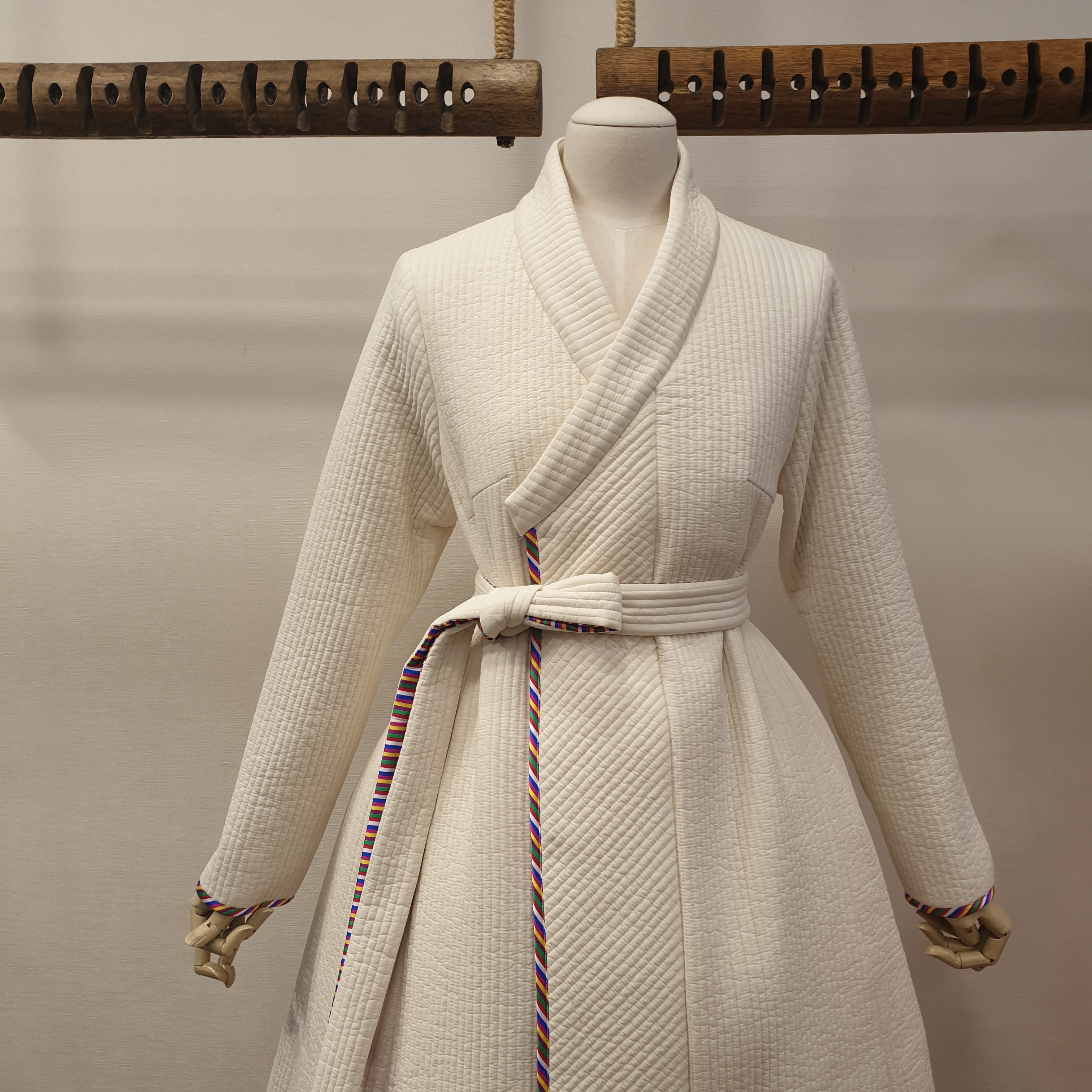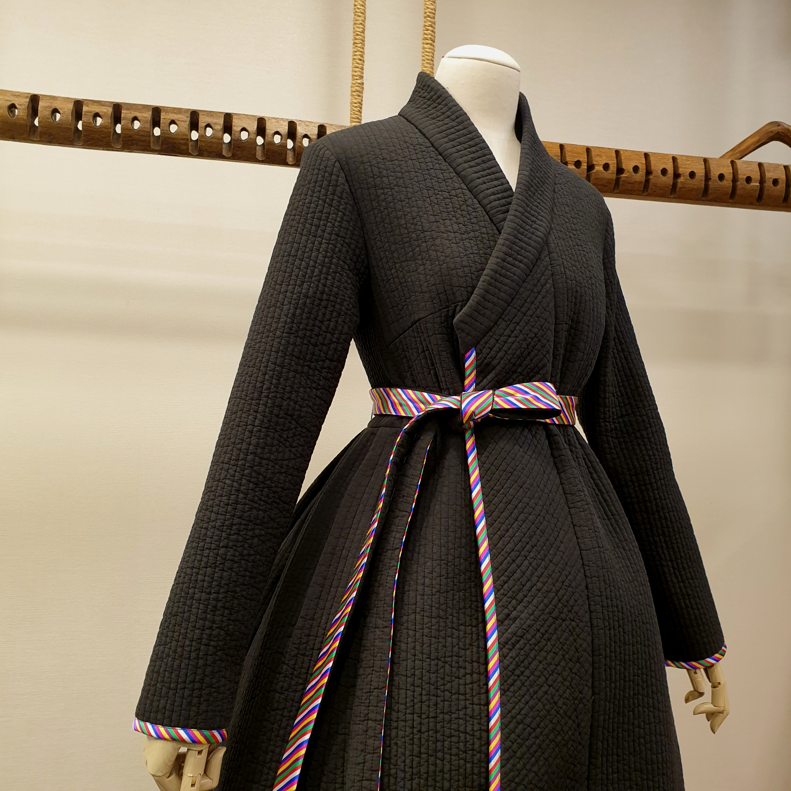 This is a quilted coat with edges decorated with colorful fabric. It is so popular in the showroom that we are including it in the special exhibition this time.