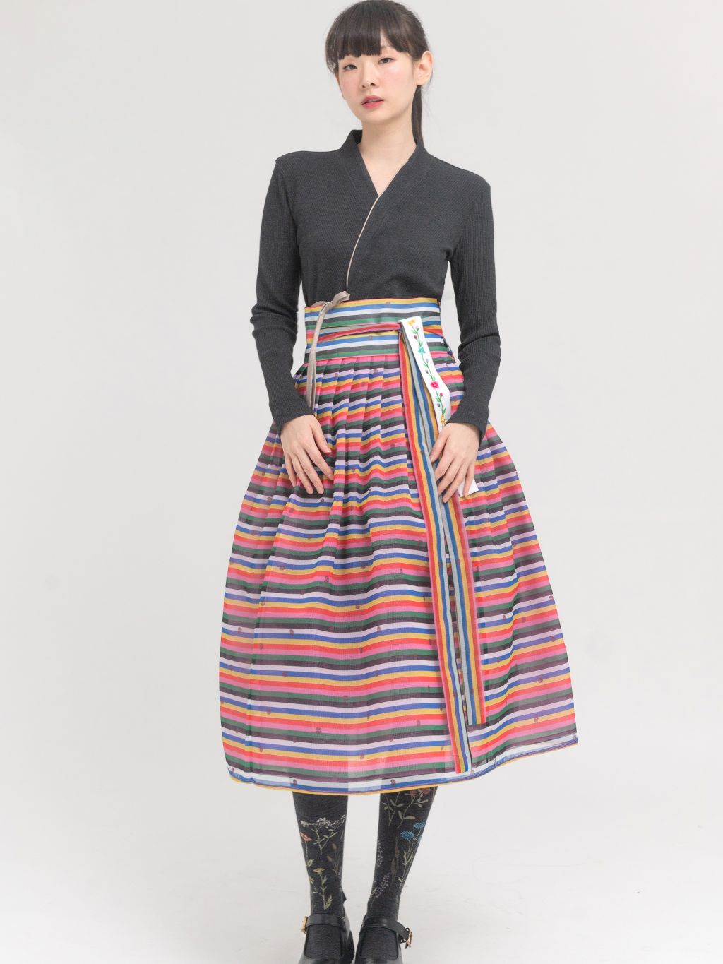 Haejin's unique colored skirt is made of a slightly transparent material.
