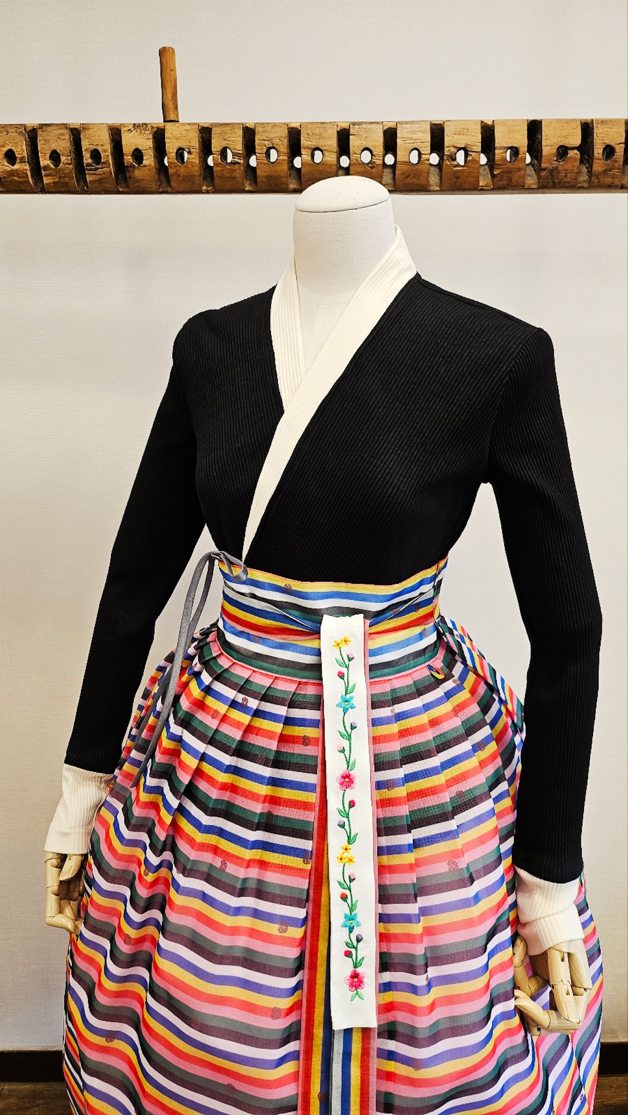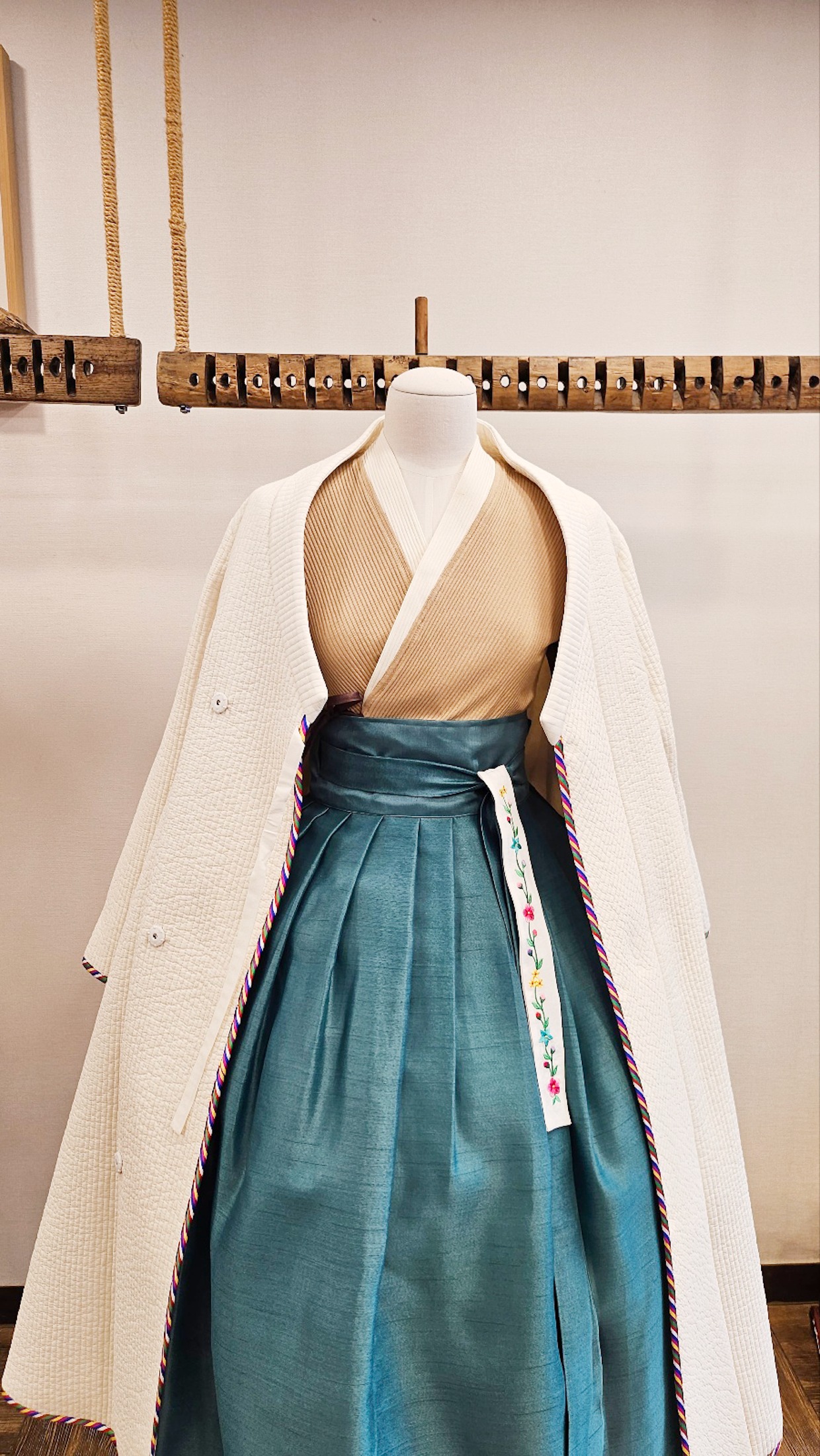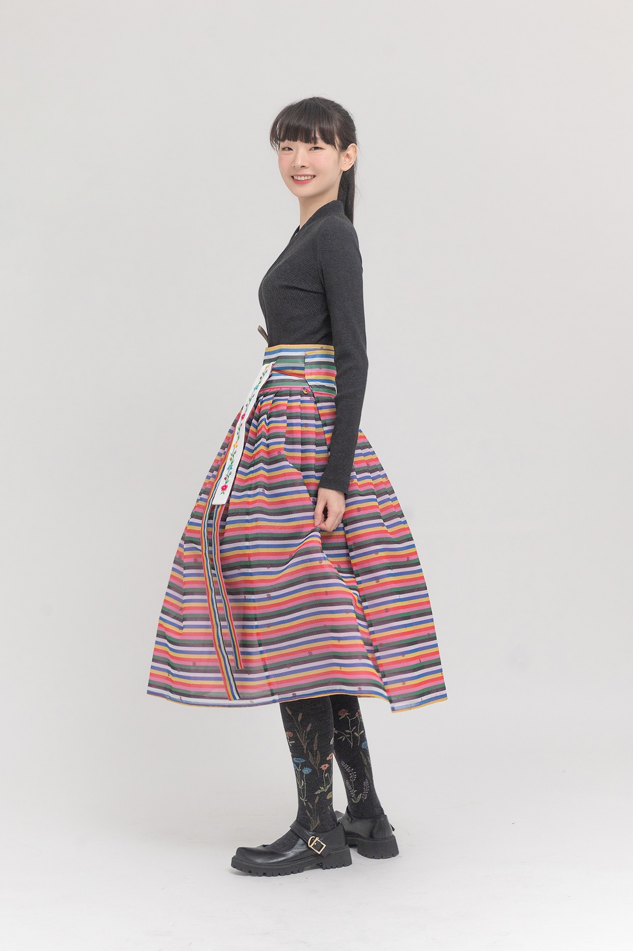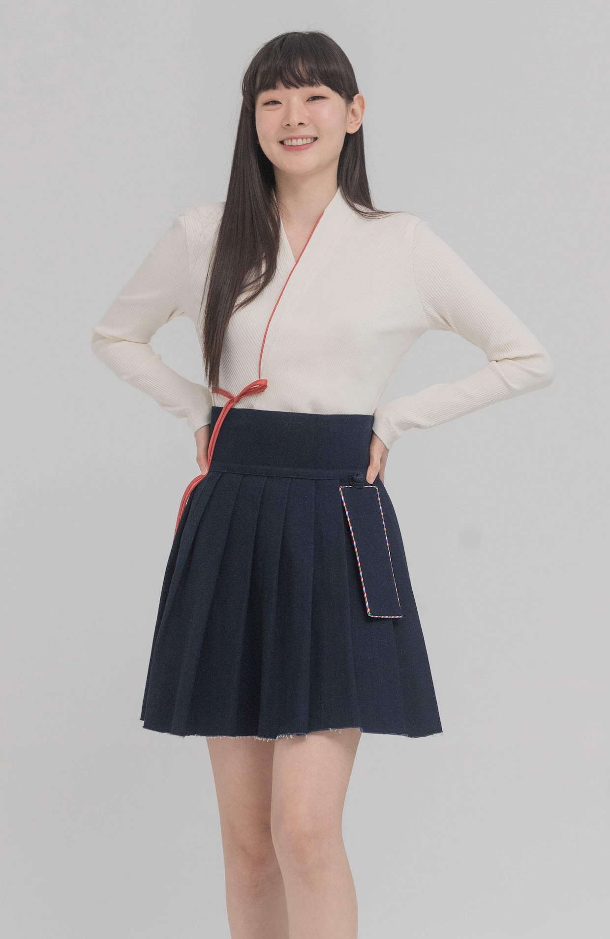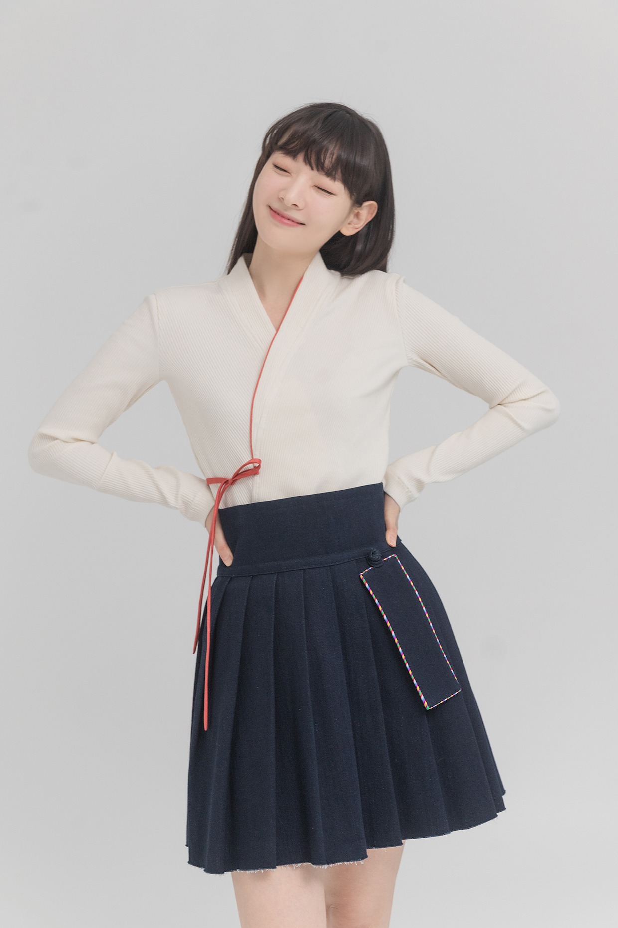 한복원단으로 만든 치마와 코디한 니트한복티 아이보리와 코디한 모습