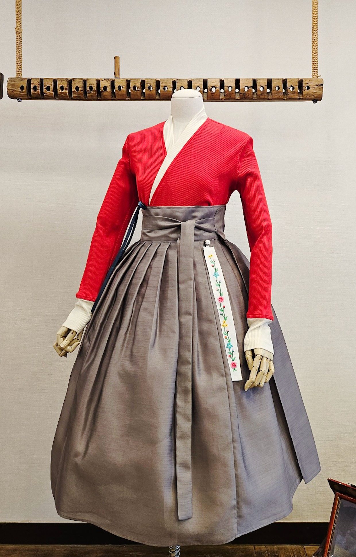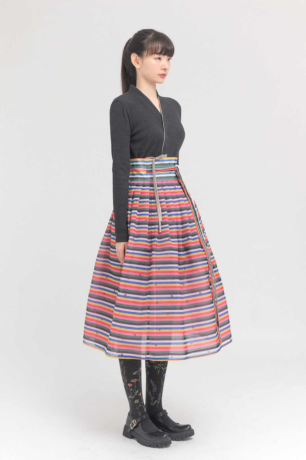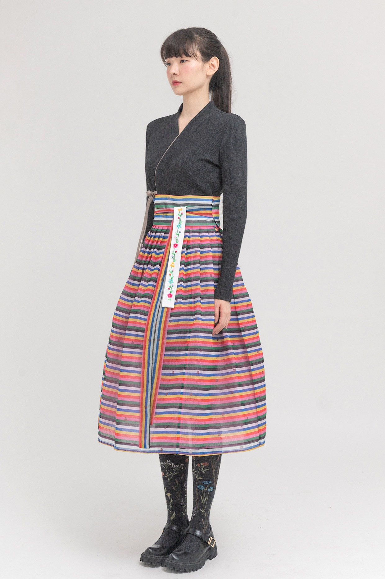 허리에서 고름을 묶고 골반쪽으로 갈수록 살짝 A라인으로 퍼지도록
