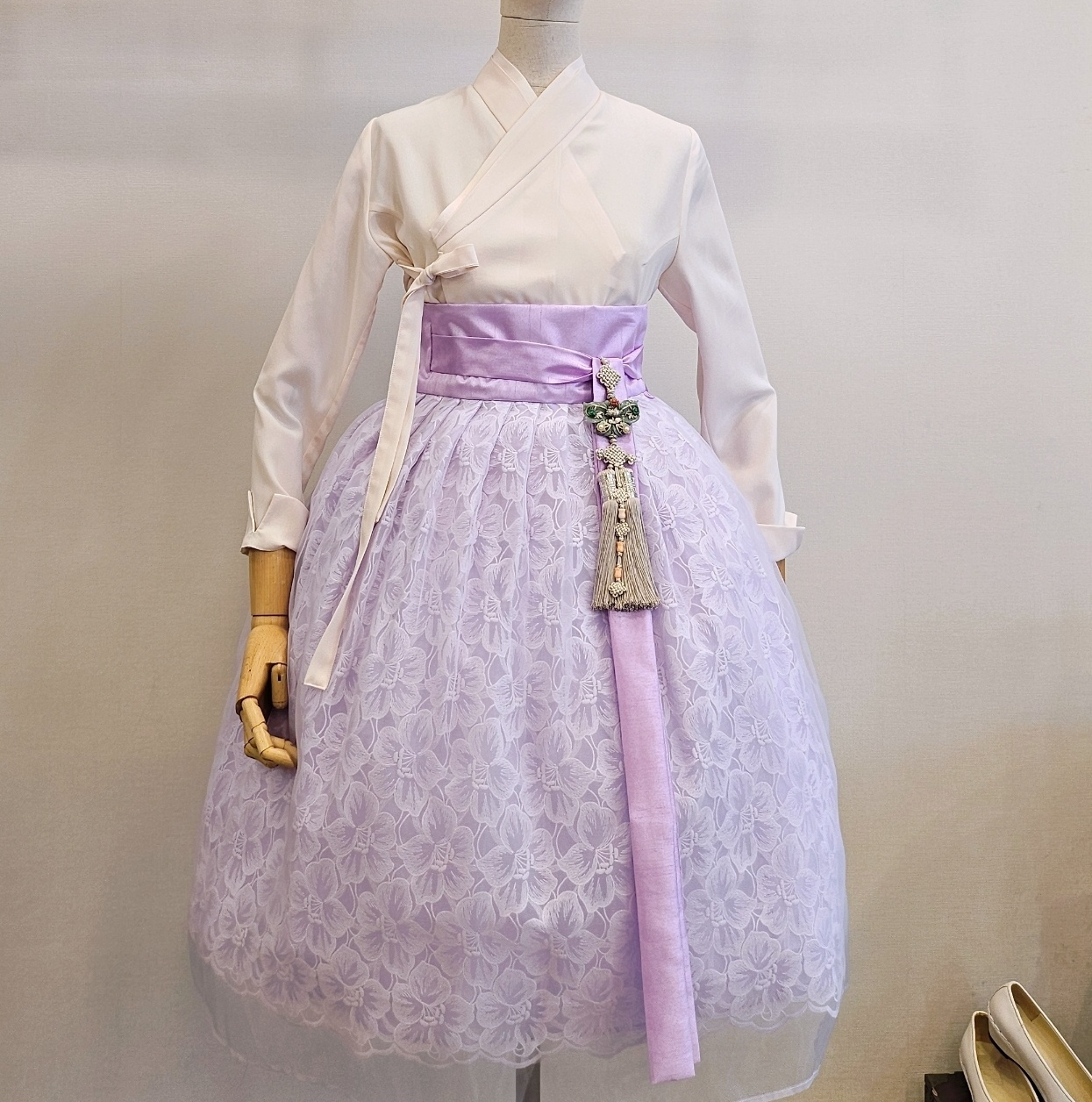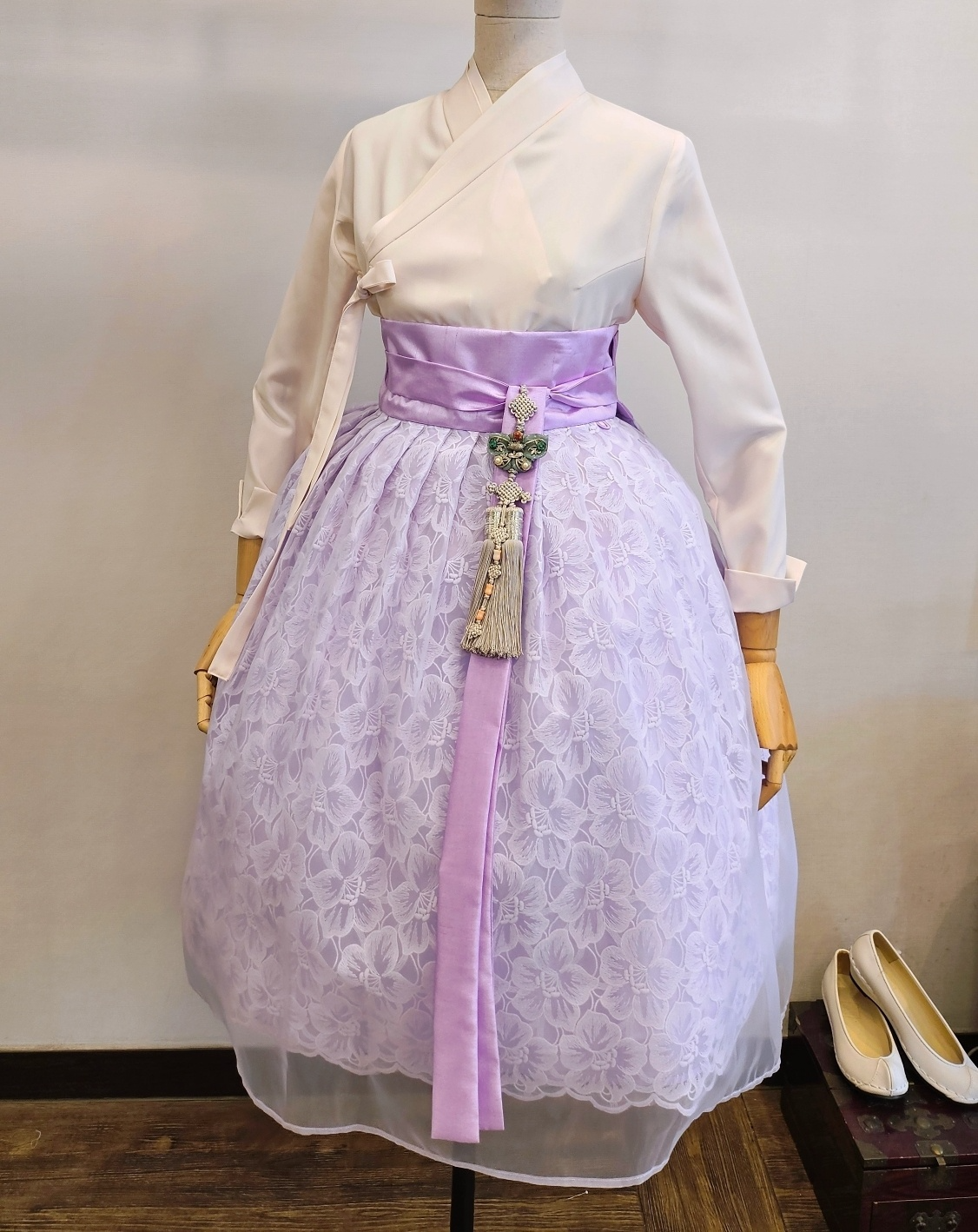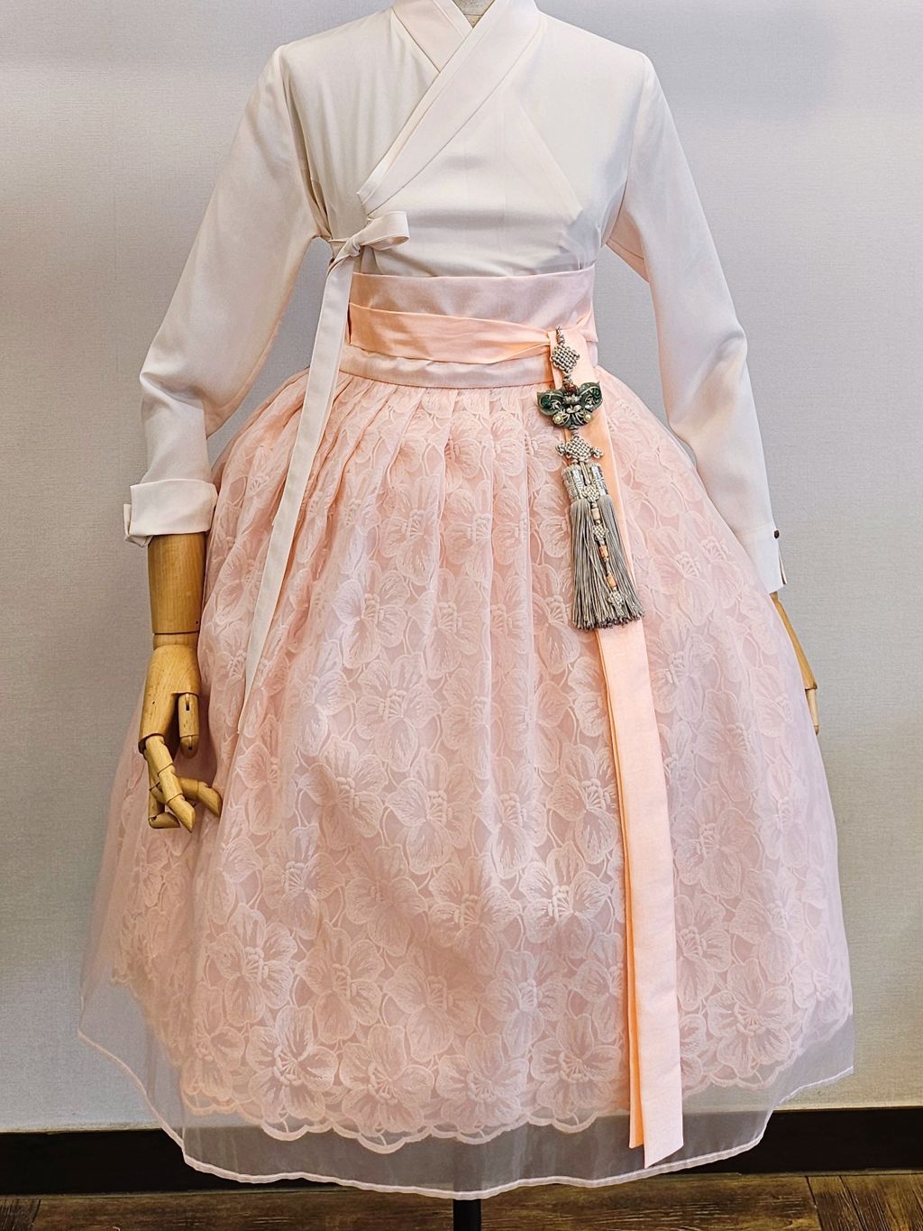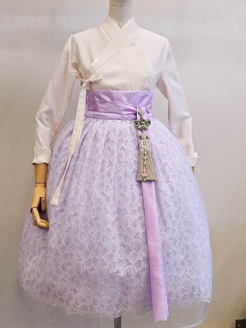 The colors are light apricot and light purple. This is a design that takes advantage of the three-dimensional feel of the hem of the embroidery by cutting it about 5cm longer than the lace.