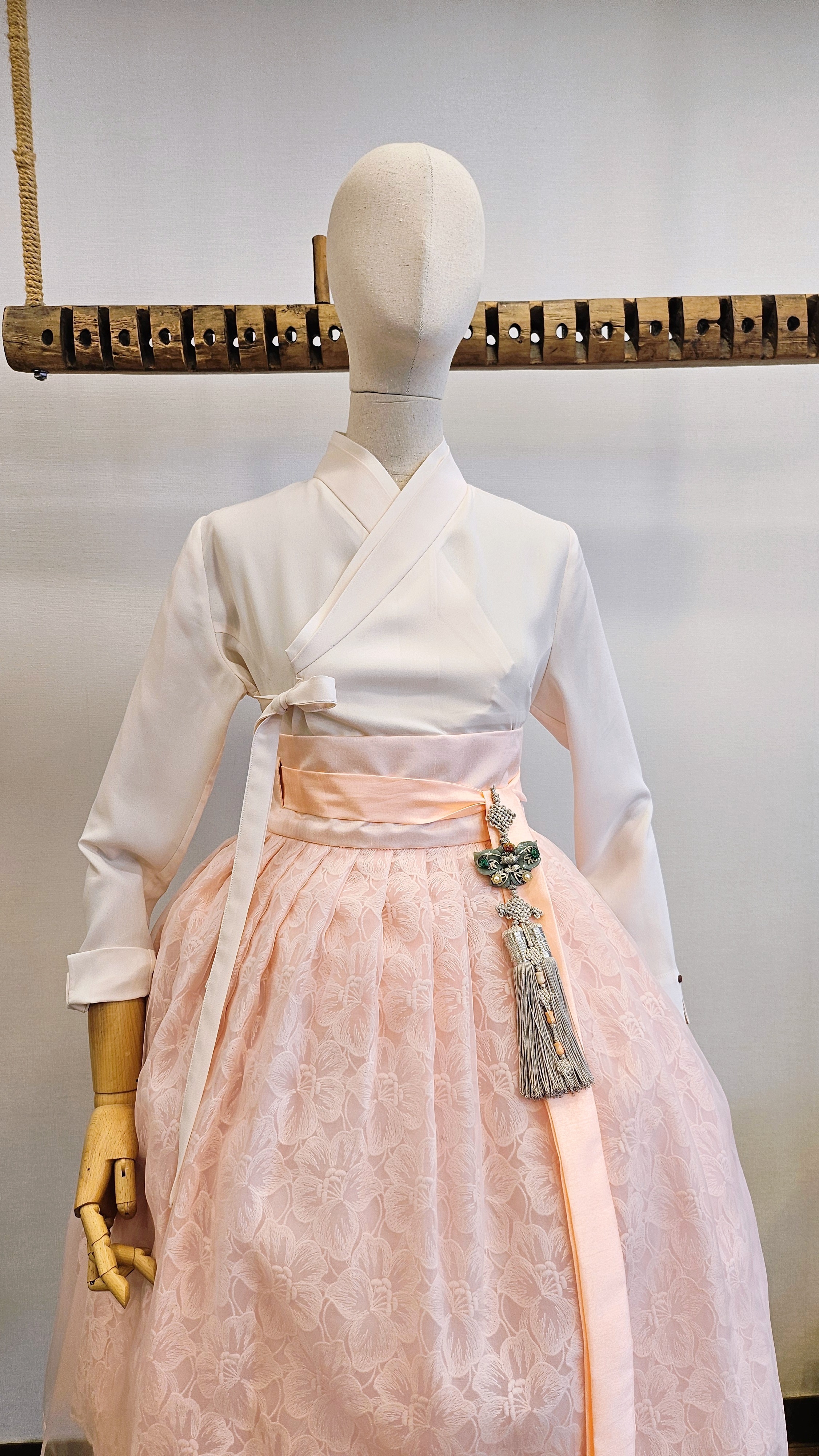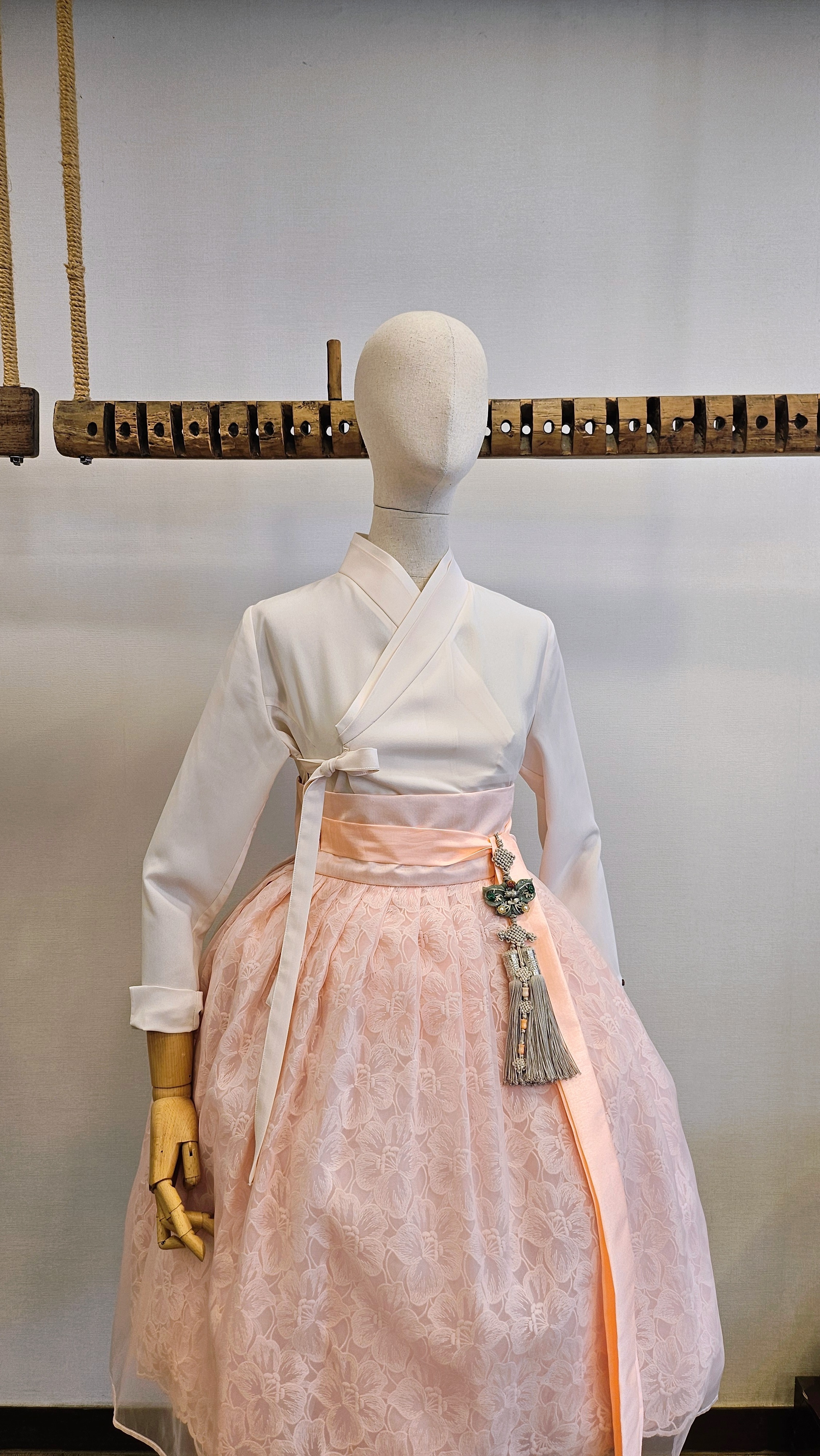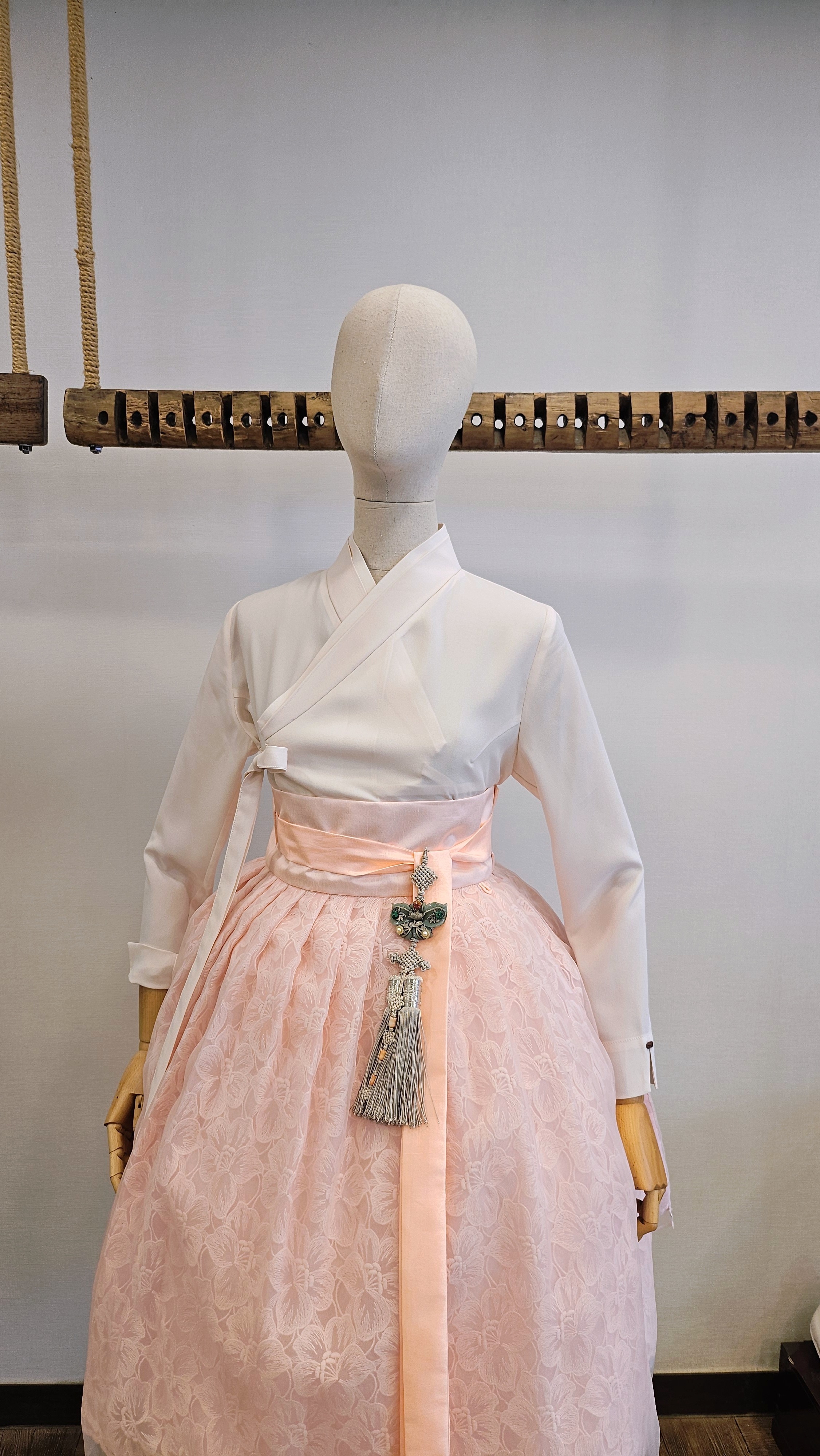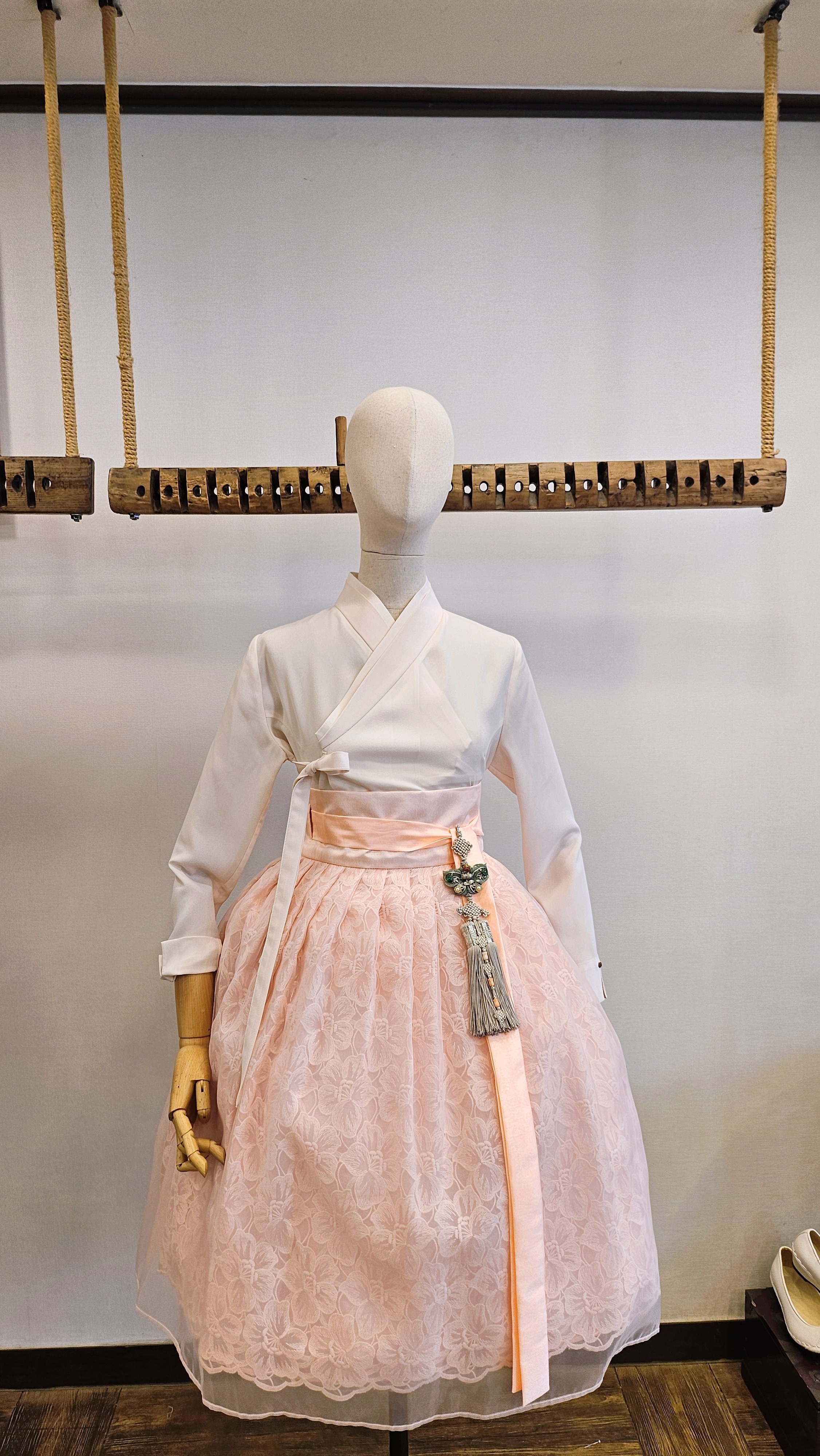 The colors are light apricot and light purple. This is a design that takes advantage of the three-dimensional feel of the hem of the embroidery by cutting it about 5cm longer than the lace.
